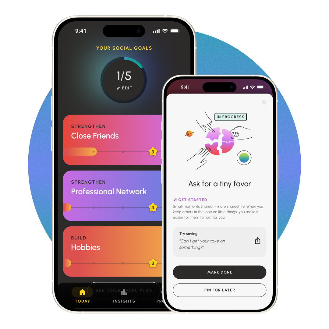 In the Sunny app, your Social Spheres offer a snapshot of the groups that make up your unique social landscape. It’s the starting point for setting social goals in the app, helping you choose where to focus your energy and take small, meaningful steps toward connection.